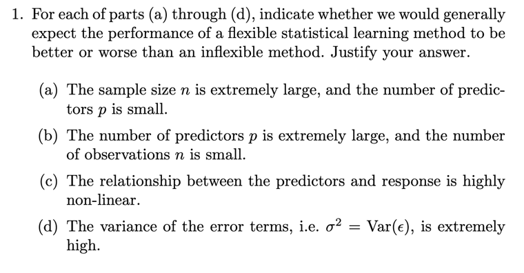 (a) inflexible biase »fiexible Flexible is generally better. A flexible method has many degrees of freedom, so it can follow the patterns in the data, even if they are highly non-linear. If the data is more linear, there are enough data points to train the parameters so that the model turns out more linear as well. If flexibility is chosen extremely large, overfitting could still occur. 大样本量:对于极大的样本量,灵活的模型往往表现更好,因为它们有更多的数据可供学习 predictor 量少:当预测变量的数量较少时,意味着数据可能具有简单的关系,这种关系可以由灵活的模型充分捕获而无需担心过拟合 (b) inflexible There is a high risk of overfitting. (c) flexible (d) inflexible (flexible model» there lots of nosiy » fiting the nosiy) 就是用对了,就是low,low。