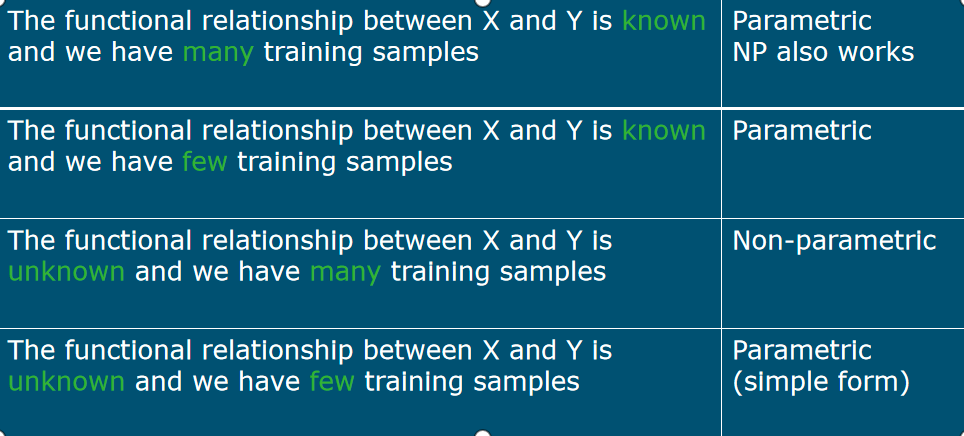 - ==less training data== dis: if the chosen functional form is too far from the truth, prediction and inference results can be poor >we don’t know the relationship in advance