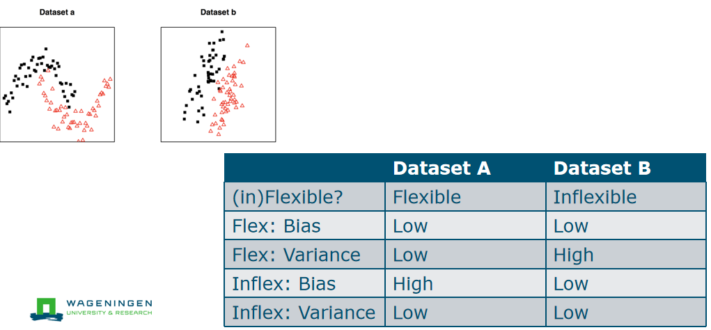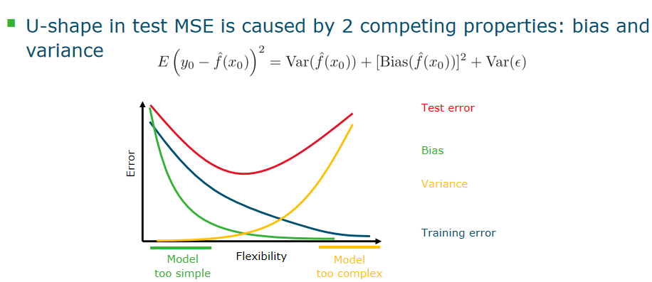 - more flexible methods have higher variance ==more flexible, less bias, more variance== Good test set performance requires ==low variance as well as low squared bias.==