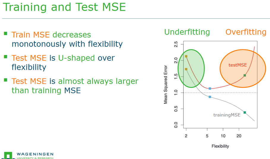 - training MSE isnot important: 增加模型的灵活性可以使其更容易适应复杂的数据模式和关系,从而可能降低训练 MSE。more flexiblity less taining MSE。